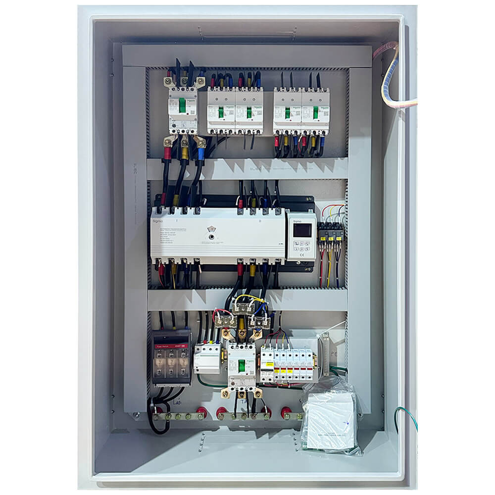 - Tủ ATS Solar Hybrid được thiết kế nhằm đảm bảo nguồn điện liên tục cho tải, kết hợp thông minh giữa điện lưới – điện mặt trời – pin lưu trữ. Hệ thống tự động ưu tiên nguồn tối ưu, giúp tiết kiệm điện năng và tăng độ tin cậy cho quá trình vận hành.
